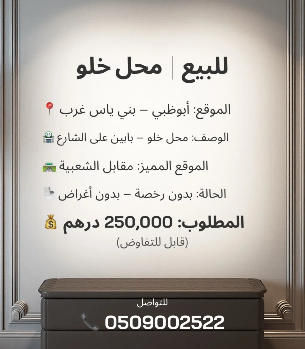 Located in Baniyas West, Abu Dhabi, directly facing a populated residential zone. The shop benefits from excellent visibility and accessibility, making it suitable for various retail or service-based businesses.